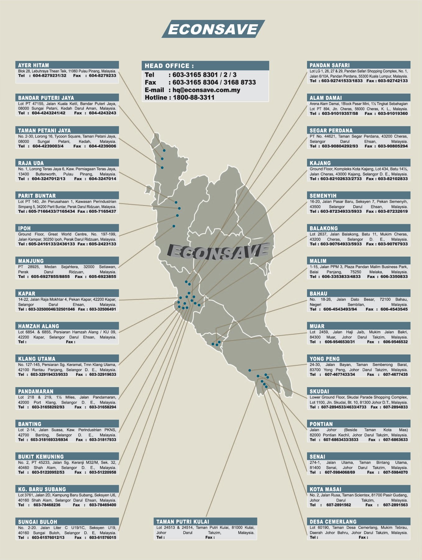 In the home state of Selangor, Econsave has the largest and most extensive network of branches in all the main towns in Selangor, unmatched by any other supermarket / hypermarket operators. Working hand in hand with Econsave means that your products will potentially reach the four million consumers in Selangor, one of the most affluent segments of the Malaysian population. In addition, Econsave has a strong presence nationwide and is constantly looking for new opportunities in Malaysia.
